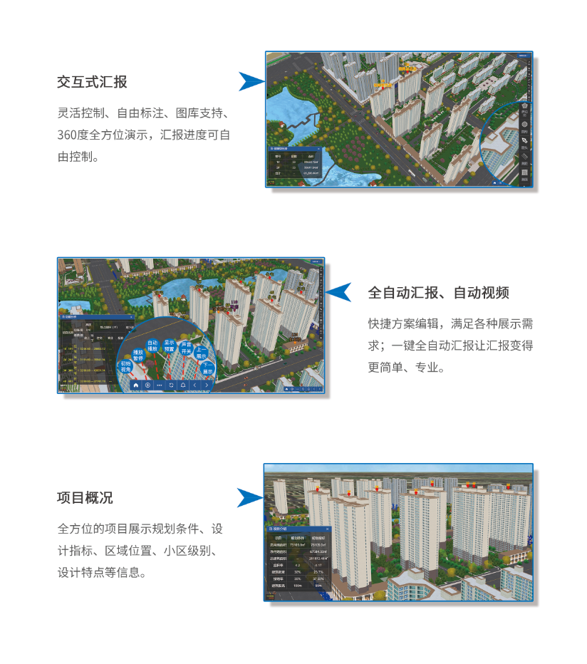 融合拓荒总控规、建筑电子审核、日照分析、市政电子审核等专业数据,为规划方案提供交互式汇报、自动汇报及视频汇报等多方式的解决方案。